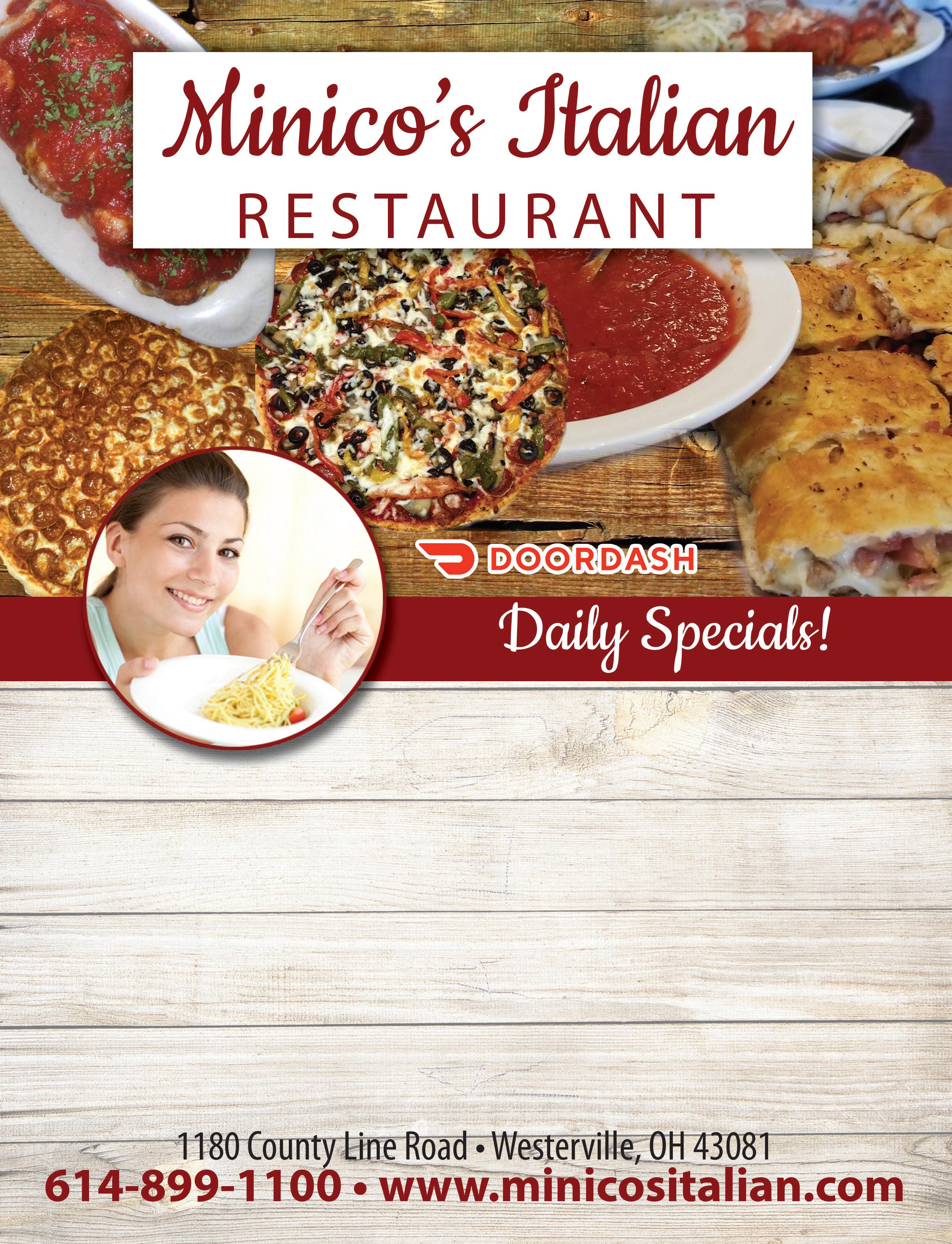 MONDAY - $7.95 Spaghetti Dinner with Meatball TUESDAY - $11.95 Large 1 Item Pizza* (Avail. for Carryout) WEDNESDAY - $11.50 Meat Lasagna Dinner THURSDAY - $11.50 Chicken or Veal Parmesan Dinner TUESDAY - $2.00 Domestic Beer WEDNESDAY - $3.50 House Wine Spaghetti OR Ziti Dinner with 4 meatballs, quart of salad & dinner rolls $19.95 $3 OFF $10 OFF $5 OFF (Carry-Out Only) (Dine-In or Carry-Out) (Dine-In or Carry-Out) (Dine-In or Carry-Out) Family Pasta Dinner Minico’s Minico’s Minico’s Minico’s Any Large Pizza $50 Purchase $25 Purchase Not valid with any other offers. Expires 4/30/21. Not valid with any other offers. Expires 4/30/21. Not valid with any other offers. Expires 4/30/21. Not valid with any other offers. Expires 4/30/21. Drink Specials! $7.95 Lunch Specials!