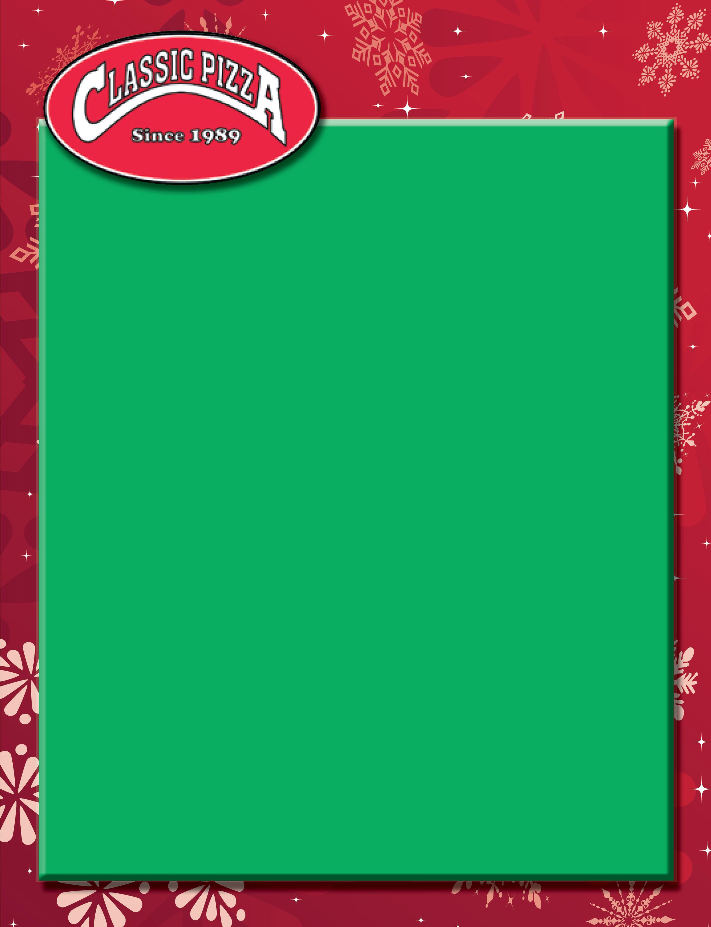 • Real Provolone Cheese • Pepperoni • Sausage • Ham • Anchovies • Bacon • Mushrooms • Hot Peppers • Jalapeno Peppers • Green Olives • Black Olives • Pineapple • Tomatoes • Onions • Green Peppers • Marinated Chicken (charged as 2 toppings) APPETIZERS Garlic Bread ........................................ 2.75 Garlic Bread with Cheese 3.95 Breadsticks .................... 3 for 1.95 / 5 for 3.25 Wings 6 for 5.95 / 10 for 9.95 ............................. 20 for 18.95 / 50 for 46.95 Boneless Wings ...... Half Order 5.50 / Single 8.95 Double Order 16.95 / Party 41.95 Mild • Hot • Classic BBQ • Teriyaki • Sweet BBQ • Roasted Garlic BBQ • Hot Garlic SALADS House Salad (small)................................3.50 House Salad (large) ................................5.95 House Salad (party) serves 10-12 .............. 25.95 Antipasta Salad .....................................6.95 Grilled Chicken Salad 7.50 Buffalo Chicken Salad ..............................7.50 Chef Salad 6.95 Taco Salad ...........................................6.95 Greek Salad (small) 4.50 Greek Salad (large).................................6.95 DRINKS We serve Pepsi products 20oz. Bottles.. 2.25 6-Pack ......5.95 2-Liter........ 2.95 SUBS www.classicpizza.biz We Deliver Add (Extra Cheese) 1.00 • Add (Extra Meat) 2.00 $2.00 OFF ANY 14” LARGE PIZZA $2.00 OFF ANY 16” $2.00 OFF OF $15 OR MORE $1.00 OFF ANY OF OUR 8” OVEN BAKED SUBS (Discount can be used on multiple subs) Valid only with coupon.Not valid with any other coupons or offers. With Town Money Saver® coupon only. Expires 1/31/21. (Discount can be used on multiple pizzas) Valid only with coupon.Not valid with any other coupons or offers. With Town Money Saver® coupon only. Expires 1/31/21. (Discount can be used on multiple pizzas) Valid only with coupon.Not valid with any other coupons or offers. With Town Money Saver® coupon only. Expires 1/31/21. Valid only with coupon.Not valid with any other coupons or offers. With Town Money Saver® coupon only. Expires 1/31/21. $4.00 OFF OF $25 OR MORE Valid only with coupon.Not valid with any other coupons or offers. With Town Money Saver® coupon only. Expires 1/31/21. Valid only with coupon.Not valid with any other coupons or offers. With Town Money Saver® coupon only. Expires 1/31/21. $2.00 OFF ANY OF OUR 14” LARGE COMBINATION PIZZAS (Discount can be used on multiple pizzas) Valid only with coupon.Not valid with any other coupons or offers. With Town Money Saver® coupon only. Expires 1/31/21. $1.00 OFF ANY 12” MEDIUM PIZZA 740 N. State St. (Located in Giant Eagle Shopping Center) 614-865-1000 Sun-Thu 11am-10pm • Fri-Sat 11am-11pm 906 S. Sunbury Rd. (Located just south of Central College Rd.) 614-882-2999 Sun-Thu 4pm-11pm • Fri-Sat 4pm-1am Mon & Tues PICK UP SPECIAL 14” Large Pizza with Cheese and 1-Topping $11.95 No coupon necessary. CURBSIDE & CARRY OUT AVAILABLE