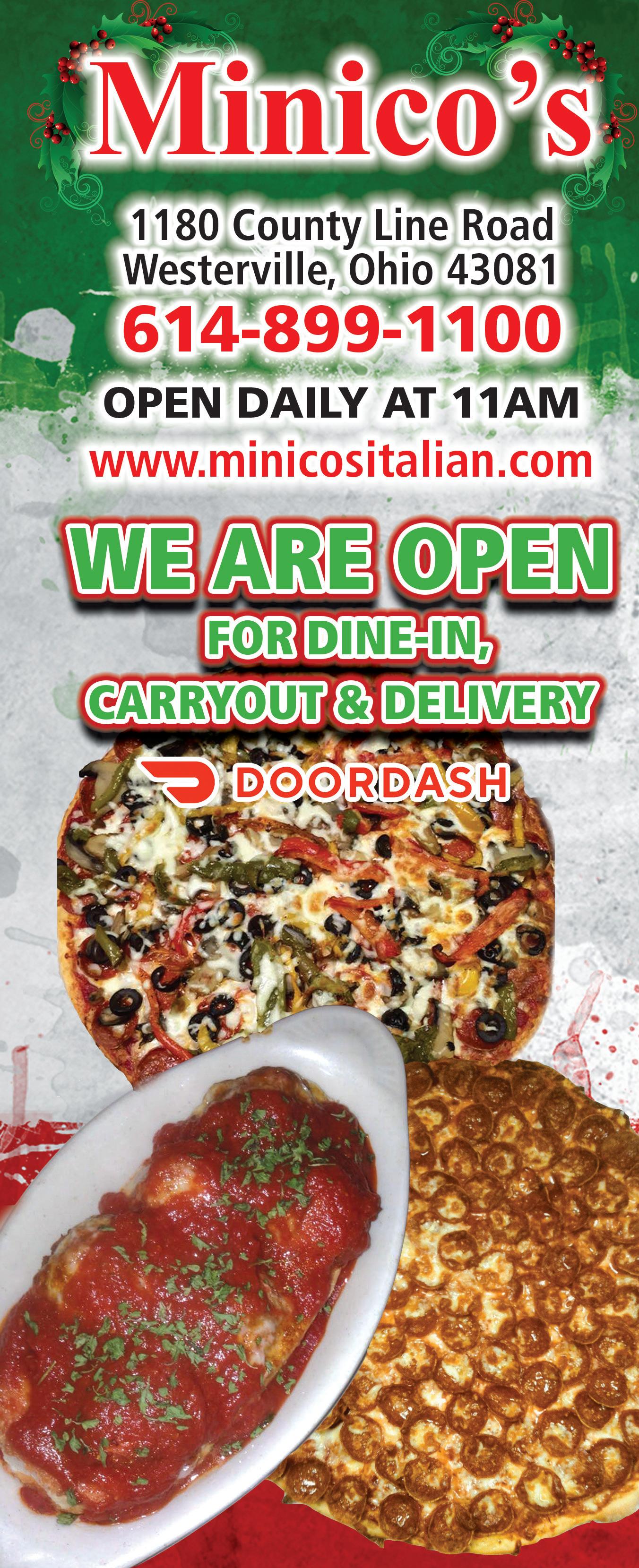 DAILY SPECIALS! DRINK SPECIALS! $7.95 LUNCH SPECIALS! TUESDAY - $2.00 Domestic Beer WEDNESDAY - $3.50 House Wine Any Large Pizza $3.00 OFF Excludes Tuesday special. Not valid with any other offers. Expires 1/7/21. (Dine-In or Carry-out) Minico’s Family Pasta Dinner Spaghetti OR Ziti Dinner with 4 meatballs, quart of salad & dinner rolls $19.95 Not valid with any other offers. Expires 1/7/21. (Carry-Out Only) Minico’s $50 Purchase $10 OFF (Dine-In or Carry-out) Not valid with any other offers. Expires 1/7/21. Minico’s Minico’s $25 Purchase $5.00 OFF Not valid with any other offers. Expires 1/7/21. (Dine-In or Carry-out) Minico’s MONDAY - $7.95 Spaghetti Dinner with Meatball TUESDAY - $11.95 Large 1 Item Pizza* (Avail. for Carryout) WEDNESDAY - $11.50 Meat Lasagna Dinner THURSDAY - $11.50 Chicken or Veal Parmesan Dinner