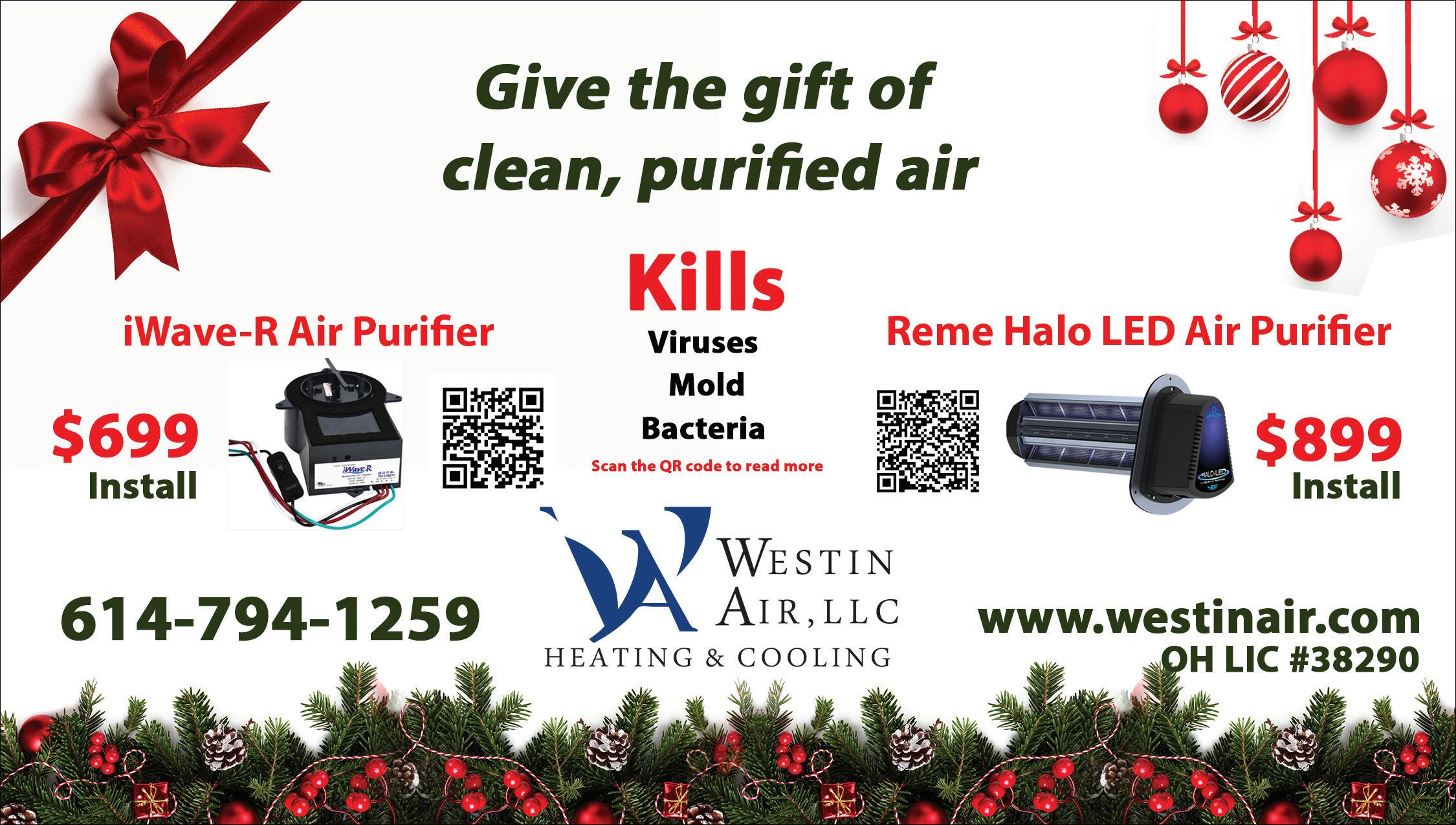 MERRY CHRISTMAS! Must mention coupon with scheduling. Not valid with other o ers or discounts. Some restrictions may apply. Expires 1/31/21. 96% E ciency, up to 60k BTU. Must mention coupon with scheduling. Not valid with other o ers or discounts. Some restrictions may apply. Call for any questions or concerns. Expires 1/31/21. GAS FURNACE TMC-1220-2 96% SUPER HIGH-EFFICIENCY 2,999 80% E ciency, up to 60k BTU. Must mention coupon with scheduling. Not valid with other o ers or discounts. Some restrictions may apply. Call for any questions or concerns. Expires 1/31/21. HIGH-EFFICIENCY GAS FURNACE TMC-1220-1 2,499 HIGH-EFFICIENCY 80% E ciency, up to 60k BTU. 13 SEER, up to 2 Ton. Permits not included. Code update not included. Not valid with other o ers or discounts. Must have existing air conditioner. Some restrictions may apply. Expires 1/31/21. FURNACE & AC TMC-1220-3 (Includes $300 Columbia Gas Rebate) 96% E ciency, up to 60k BTU. 13 SEER, up to 2 Ton. Permits not included. Code update not included. Not valid with other o ers or discounts. Must have existing air conditioner. Some restrictions may apply. Expires 1/31/21 FURNACE & AC TMC-1220-4 Must mention coupon with scheduling. Not valid with other o ers or discounts. Some restrictions may apply. Expires 1/31/21. with any completed paid repair Must mention coupon with scheduling. Not valid with other o ers or discounts. Some restrictions may apply. Expires 1/17/21. must schedule before Jan. 17 5,499 6,499 96% SUPER HIGH-EFFICIENCY Must mention coupon with scheduling. Not valid with other o ers or discounts. Some restrictions may apply. Expires 1/31/21. (Includes $300 Columbia Gas Rebate) TMC-1220-5 TMC-1220-6 TMC-1220-7 TMC-1220-8 IWAVE-R AIR CLEANER DUCTLESS MINI-SPLIT CERTIFIED 5.0 Rated BUSINESS website: www.westervilleair.com 614 - 957 - 7785