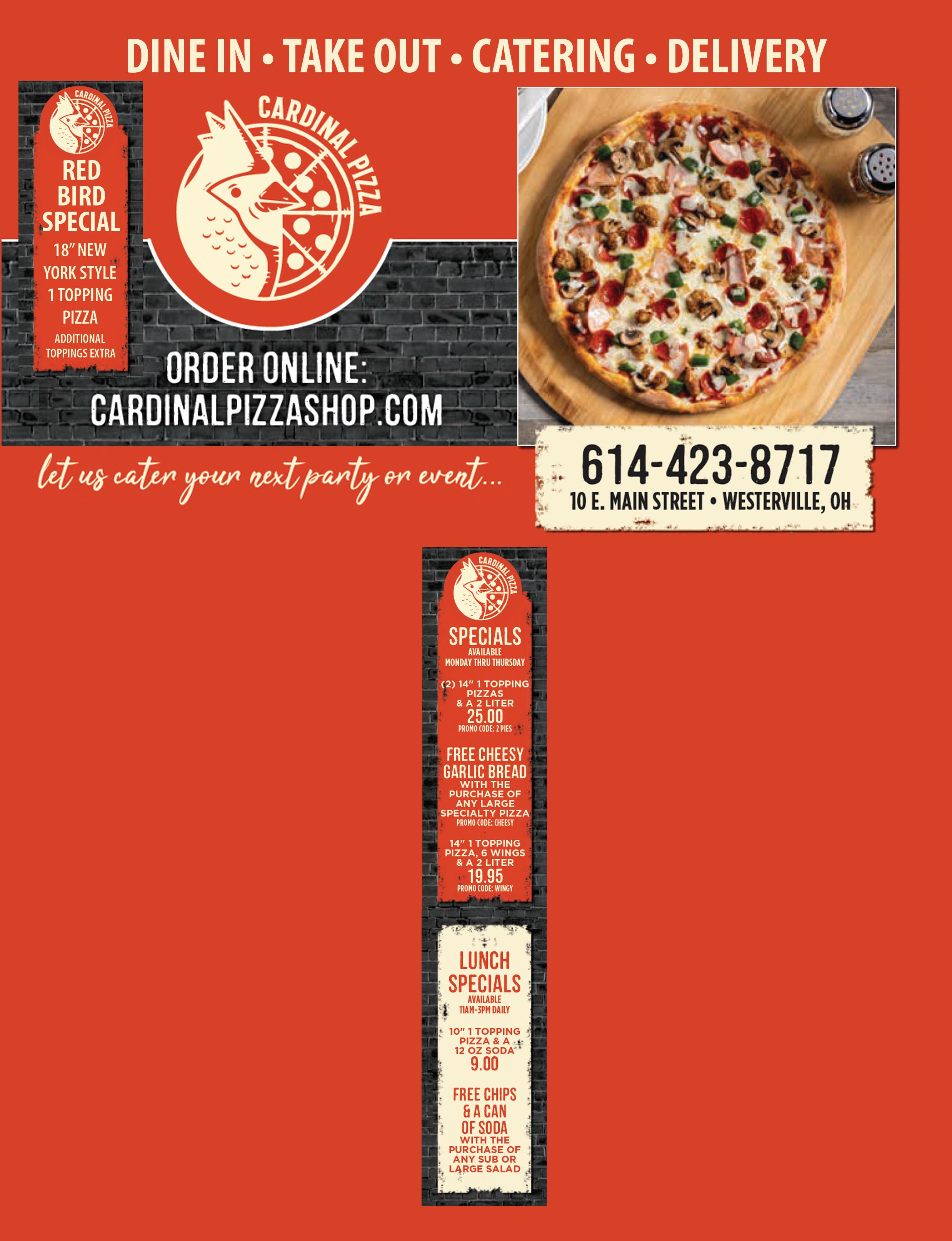 LEWIS CENTER 1035 Polaris Parkway 614-384-0555 WESTERVILLE 7397 State Route 3 614-823-4040 COLUMBUS 1894 Hard Rd 614-766-0300 ORDER ONLINE DOMINOS.COM FREE 8” Italian Hoagie with purchase of 16” Super Hoagie 1 coupon per customer. Must present at time of ordering. Not valid with any other discount or special. Expires 1/31/21. 10% OFF Any Party Hoagie! 1 coupon per customer. Must present at time of ordering. Not valid with any other discount or special. Expires 1/31/21. 3 FOOT SUB $40.00 3” Cut = 12 pieces • 2” Cut = 18 pieces 4 FOOT SUB $50.00 3” Cut = 16 pieces • 2” Cut = 24 pieces 6 FOOT SUB $65.00 3” Cut = 24 pieces • 2” Cut = 36 pieces 614-890-2228 • 614-890-2230 475 S. State St. Sun 12-6 • Mon-Tue 11-8 • Wed-Sat 11-9 OUR DRIVE THRU WINDOW IS OPEN! (2 Day Preferred)Notice