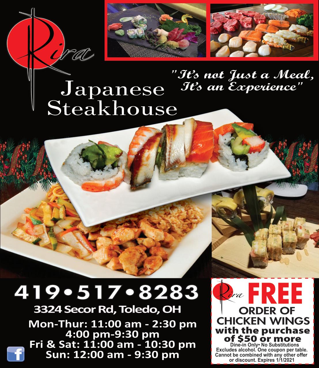 Support LOCAL businesses! Shop locally. Shop safely. WEST TOLEDO DECEMBER 2020 To advertise, call 419.466.7358 Sun- Thurs 12pm-9:30pm Friday 12pm-10:30pm Saturday 12pm-10:30pm 3535 Secor Rd. Toledo, Ohio HOURS: 10% OFF Excludes alcohol. One coupon per table Cannot be combined with any other offer or discount. Expires 1/1/2021 Dine-in Only• No Substitutions 419-851-0058 TUES - SUN 11am - 9pm Closed MON 5228 Monroe St. Toledo 43623 (419) 214-1790 Biryani Samosa Dosa Not valid with other offers. With TMS coupon. Expires 12/31/20 $25 $5 BOMBAY KITCHEN OR ORDER ONLINE AT bombaykitchen419.com & click on delivery options