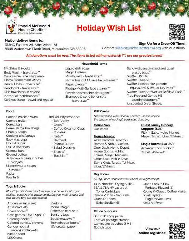 The Town of Brookfield is once again collecting items for the Ronald McDonald House Charities (RMHC). RMHC programs and services address the essential needs of families - all along their child’s healthcare journey - so they can focus on the health and well-being of their child. Items needed range from household items, to food, to toys and books. A full list of requested items is listed below.