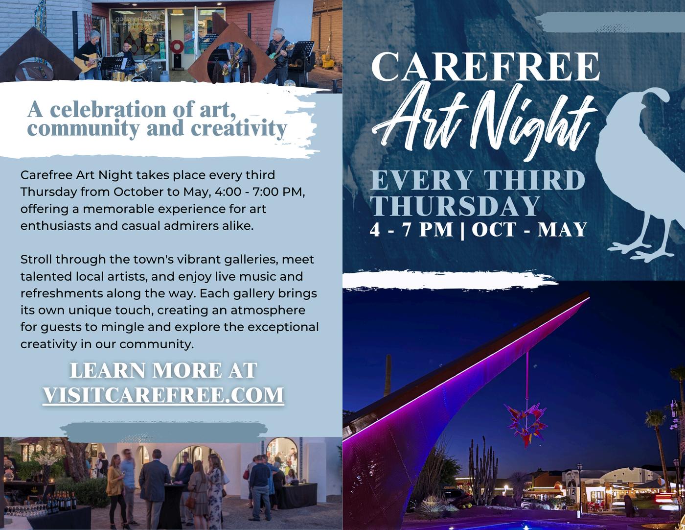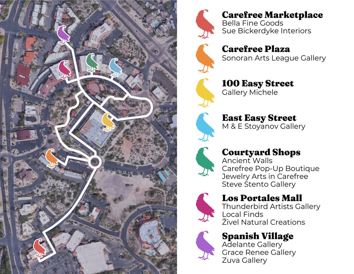 Every third Thursday from October through May, Carefree’s galleries and studios stay open late for an evening of art, wine, and community. Explore paintings, sculptures, jewelry, and more, with featured artists and special exhibitions at each stop. Use this map to guide your Art Night adventure—discover local shops along the way and finish your evening with dinner at one of Carefree’s charming restaurants.