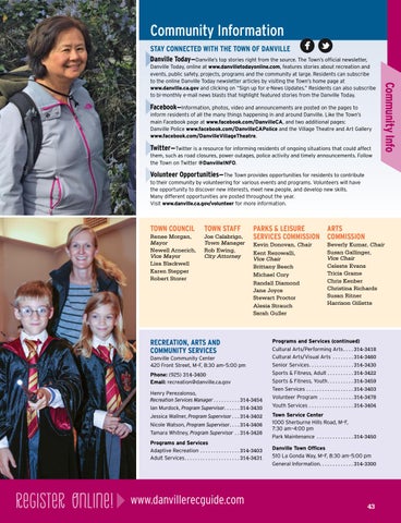 Programs and Services (continued) Cultural Arts/Performing Arts. . . . 314-3418 Cultural Arts/Visual Arts . . . . . . . . 314-3460 Senior Services. . . . . . . . . . . . . . . . . 314-3430 Sports & Fitness, Adult. . . . . . . . . . 314-3422 Sports & Fitness, Youth. . . . . . . . . . 314-3459 Teen Services. . . . . . . . . . . . . . . . . . 314-3403 Volunteer Program . . . . . . . . . . . . . 314-3478 Youth Services. . . . . . . . . . . . . . . . . 314-3404 Town Service Center 1000 Sherburne Hills Road, M–F, 7:30 am–4:00 pm Park Maintenance . . . . . . . . . . . . . . 314-3450 Danville Town Offices 510 La Gonda Way, M–F, 8:30 am–5:00 pm General Information. . . . . . . . . . . . . 314-3300