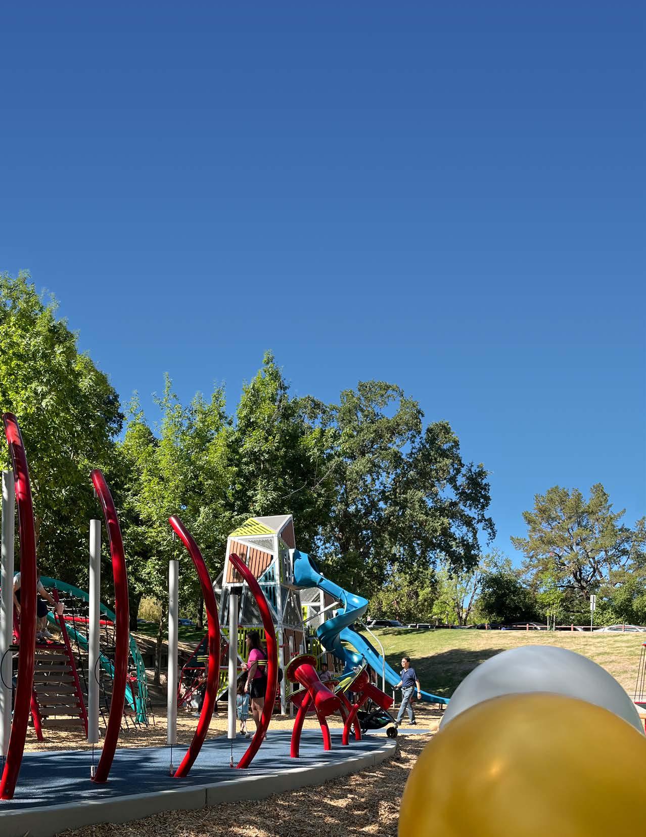 The most popular feature at the playground is an extra-high tower with a spiral slide. Kids (of all ages) can also work their way up to the big tower by starting on a smaller tower with a shorter slide. With musical elements, accessible play stations, and opportunities for intergenerational play, the new playground areas represent a significant investment in quality of life for Danville residents.