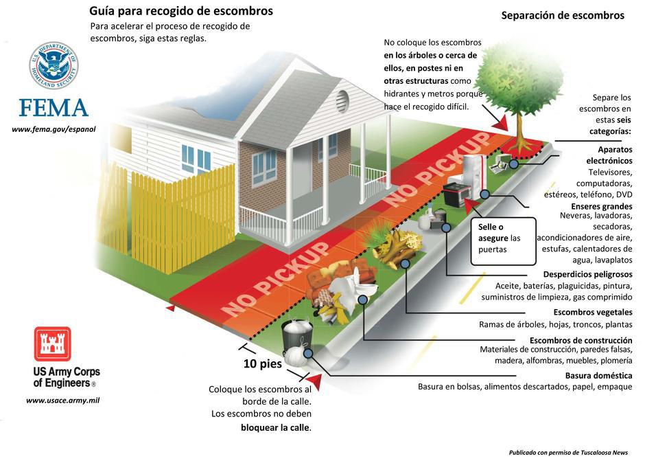• Cuando coloque sus escombros al borde de la carretera, por favor separe los diferentes tipos de escombros en distintas pilas para facilitar una recolección más rápida: escombros vegetativos sueltos, desperdicios peligrosos (pintura, pesticidas, etc.), electrodomésticos o “electrónicos” (refrigeradores, unidades de aire acondicionado, etc.) y escombros de construcción/demolición.