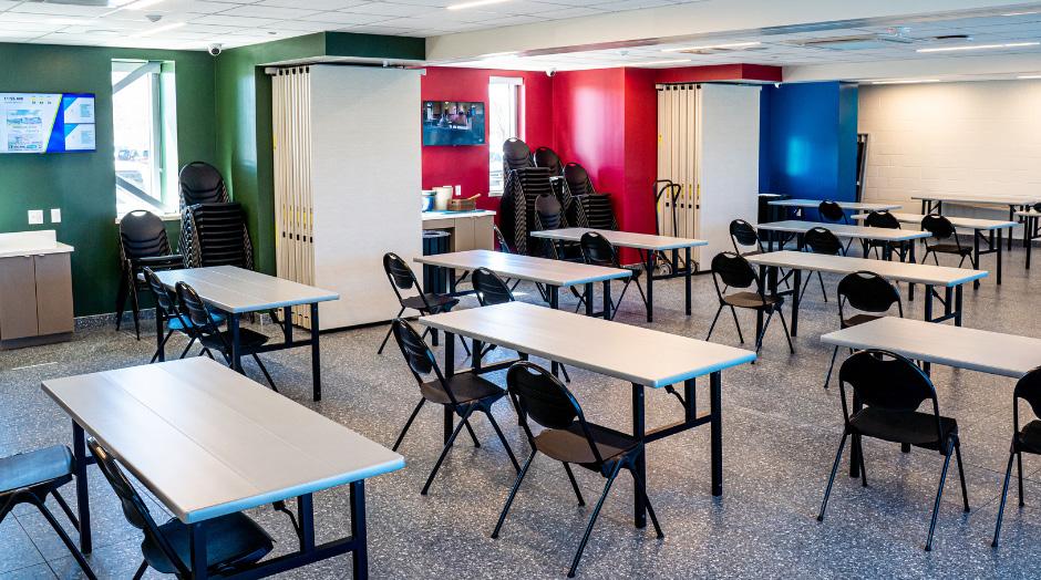 Multi-Purpose Room with Kitchen. The Multi-Purpose room is a large 28’x42’ tiled room with an attached kitchen. A screen and projector are available and this room has a capacity of 86 people.