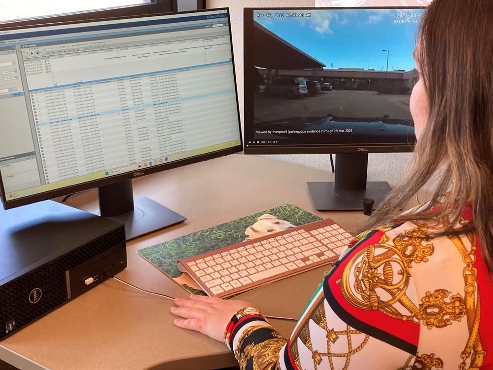 The Parker Police Department purchased a FARO system (above right) in 2022 and trained staff members in its numerous abilities to assist with accident reconstruction, crime scene reconstruction, investigations and legal prosecutions. The FARO system utilizes 3D reality capture technology that exemplifies accurate and precise measurements that bring virtual representations of accident and crime scenes to the tips of investigators’ fingers and computer screens. This system increases the strength of evidence officers, and detectives gather for court proceedings.