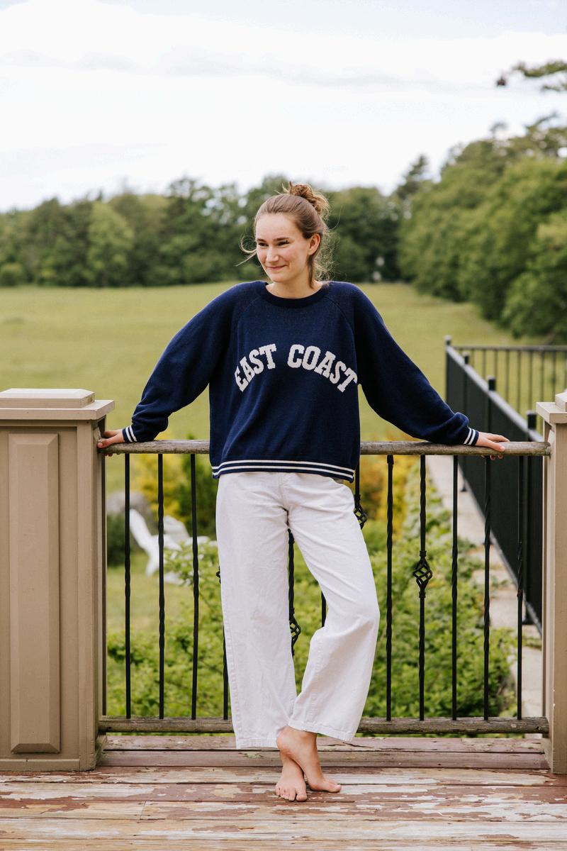 Our everyday go-to! This pullover crewneck sweater offersa relaxed fit with straight cuffs and a split hi-low hem. Dropped shoulder design, uppercase lettering, and a variety of customization options in fonts, stripes, and stitching styles make this a versatilehit for any wardrobe.