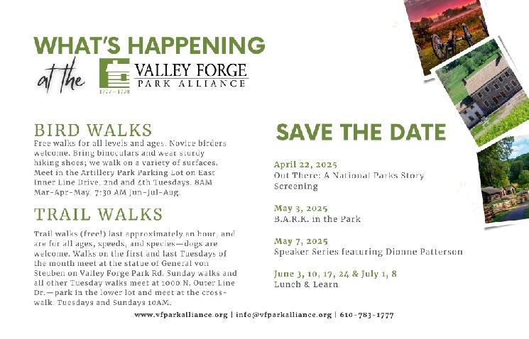 The Valley Forge Park Alliance inspires appreciation for and citizen stewardship of Valley Forge National Historical Park. As the Park's philanthropic partner, the Alliance connects people to the Park through education, preservation, and celebration of its natural and historical resources. The Alliance enhances the visitor experience while protecting the Park's rich history for future generations.