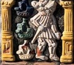 Stepping away from the mansion for a while, we move to the Mercer tiles embedded in the concrete bridge crossing Little Darby Creek, near the picnic area of the park. These glazed clay tiles, produced at the historic Moravian Pottery and Tile Works in Doylestown, depict various scenes, including scenes of Christopher Columbus's travels to and from the New World and a monstrous marine snake swallowing a sailor. When, why and by whom were these tiles installed? Returning to the mansion, we find more Mercer tiles - or what are believed to be Mercer tiles - in the fireplace in the library under a thick layer of historic soot. These are simple red clay tiles with no images. Were they installed by the first owners of the mansion or by subsequent owners?