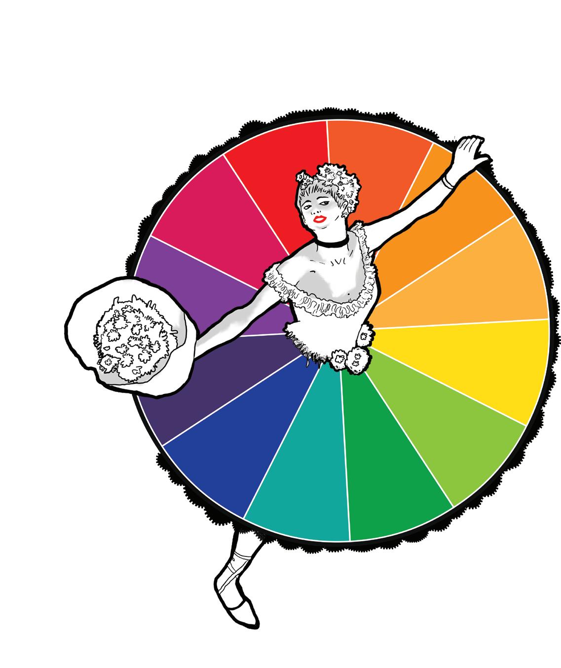 Name the colours you see on the colour wheel by matching the shapes on the dancer’s skirt: