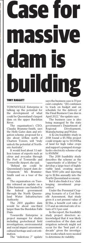 After three years of work, Townsville Enterprise delivered the final Business Case for Hells Gates Dam in May 2022. The detailed Business Case brought together detailed technical studies, market testing, economic feasibility, and cultural and social impacts. It demonstrated the project’s viability delivering a Benefit Cost Ratio of 1.05, a potential economic contribution of $6B and 3,300 new jobs. Securing additional large-scale water infrastructure will be one of the single biggest enablers for our region. Townsville Enterprise’s advocacy on the project saw the Morrison Federal Government announce a $5.4B funding package to build the nationally significant Hells Gates Dam Project, with commitment out past the current estimates. A change of Government