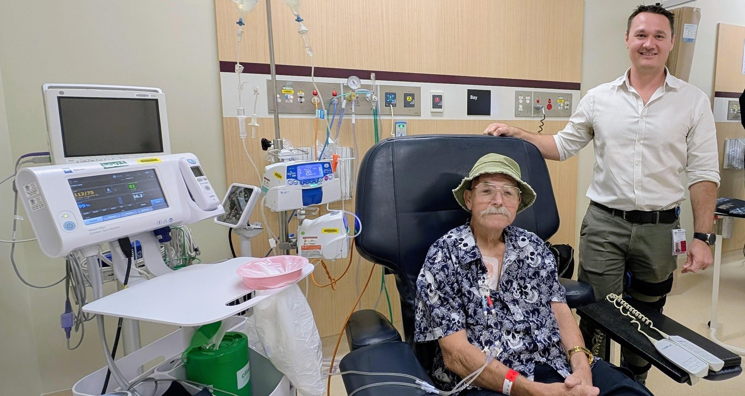 Warren Hermann receiving his CAR T-cell treatment with Dr Joel Wight