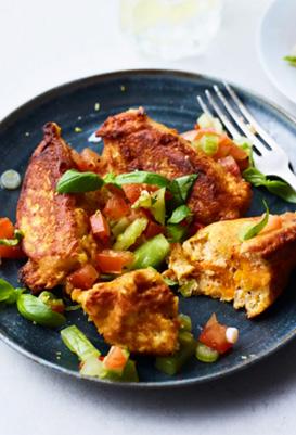 7.Serve immediately with a generous dollop of tomato salsa, then repeat with the remaining batter.