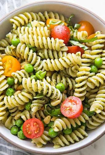 4. Mix the salad pasta: Put pasta in a big bowl. Mix in fresh basil pesto, green olives, and pine nuts. Gently toss in cherry tomatoes, peas, fresh basil leaves, and olive oil. Add salt and pepper to taste.