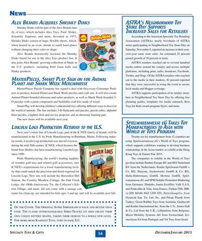 According to the American Specialty Toy Retailing Association (ASTRA), nearly two-thirds of ASTRA stores participating in Neighborhood Toy Store Day on Saturday, November 8, reported an increase in their yearover-year same store sales. An estimated 25 percent posted growth of 20 percent or more. ASTRA retailers reached out to several hundred media outlets around the country and across multiple platforms, including print, radio, broadcast, Facebook, Twitter, and blogs. Of the ASTRA retailers who reached out to the media in their markets, 82 percent reported that they were successful in using the event to secure local media and blogger coverage. ASTRA supports participation of its retailer members in Neighborhood Toy Store Day by offering free planning guides, templates for media outreach, Best Toys for Kids award program flyers, and more.