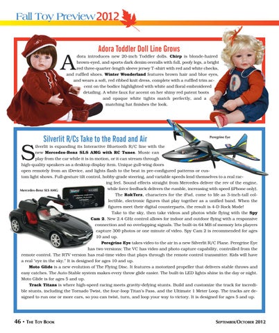 ilverlit is expanding its Interactive Bluetooth R/C line with the new Mercedes-Benz SLS AMG with RC Tunes. Music can play from the car while it is in motion, or it can stream through high-quality speakers as a desktop display item. Unique gull-wing doors open remotely from an iDevice, and lights flash to the beat in pre-configured patterns or custom light shows. Full-gesture tilt control, hobby-grade steering, and variable speeds lend themselves to a real racing feel. Sound effects straight from Mercedes deliver the rev of the engine, while force feedback delivers the rumble, increasing with speed (iPhone only). Mercedes-Benz SLS AMG The RokTerz, characters for the iPad, come to life as 3-inch-tall collectible, electronic figures that play together as a unified band. When the figures meet their digital counterparts, the result is 4-D Rock Mode! Take to the sky, then take videos and photos while flying with the Spy Cam 2. New 2.4 GHz control allows for indoor and outdoor flying with a responsive connection and no overlapping signals. The built-in 64 MB of memory lets players capture 300 photos or one minute of video. Spy Cam 2 is recommended for ages 10 and up. Peregrine Eye takes video to the air in a new Silverlit R/C Plane. Peregrine Eye has two versions: The VC has video and photo capture capability, controlled from the remote control. The RTV version has real-time video that plays through the remote control transmitter. Kids will have a real “eye in the sky.” It is designed for ages 10 and up. Moto Glide is a new evolution of The Flying Disc. It features a motorized propeller that delivers stable throws and easy catches. The Auto Stable system makes every throw glide easier. The built-in LED lights shine in the day or night. Moto Glide is for ages 5 and up. Track Titans is where high-speed racing meets gravity-defying stunts. Build and customize the track for incredible stunts, including the Tornado Twist, the four-loop Titan’s Pass, and the Ultimate 1 Meter Loop. The tracks are designed to run one or more cars, so you can twist, turn, and loop your way to victory. It is designed for ages 5 and up.
