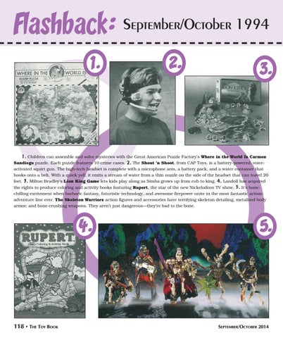 1. Children can assemble and solve mysteries with the Great American Puzzle Factory’s Where in the World Is Carmen Sandiego puzzle. Each puzzle features 10 crime cases. 2. The Shout ’n Shoot, from CAP Toys, is a battery-powered, voiceactivated squirt gun. The high-tech headset is complete with a microphone arm, a battery pack, and a water container that hooks onto a belt. With a quick yell, it emits a stream of water from a thin nozzle on the side of the headset that can travel 20 feet. 3. Milton Bradley’s Lion King Game lets kids play along as Simba grows up from cub to king. 4. Landoll has acquired the rights to produce coloring and activity books featuring Rupert, the star of the new Nickelodeon TV show. 5. It’s bonechilling excitement when barbaric fantasy, futuristic technology, and awesome firepower unite in the most fantastic actionadventure line ever. The Skeleton Warriors action figures and accessories have terrifying skeleton detailing, metalized body armor, and bone-crushing weapons. They aren’t just dangerous—they’re bad to the bone.