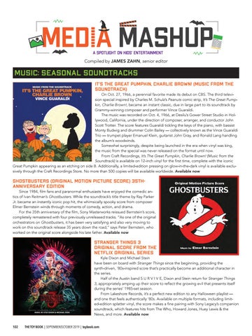 STRANGER THINGS 3 — ORIGINAL SCORE FROM THE NETFLIX ORIGINAL SERIES Kyle Dixon and Michael Stein have been on board with Stranger Things since the beginning, providing the synth-driven, ‘80s-inspired score that’s practically become an additional character in the series. Half of the Austin band S U R V I V E, Dixon and Stein return for Stranger Things 3, appropriately amping up their score to reflect the growing evil that presents itself during the series’ 1985-set season. From Lakeshore Records, it’s a perfect new edition to any Halloween playlist — and one that feels authentically ‘80s. Available on multiple formats, including limited-edition splatter vinyl, the score makes a fine pairing with Sony Legacy’s companion soundtrack, which features hits from The Who, Howard Jones, Huey Lewis & the News, and more. Available now 102 THE TOY BOOK | SEPTEMBER/OCTOBER 2019 | toybook.com