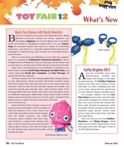 asic Fun introduces new products for Moshi Monsters. Moshi Monsters accessories include key chains, zippsters, and charmlings. Zippsters are 3-D mini figures that come blindboxed and attach to a backpack or jacket with 11 in a set. Charmlings are enameled charms that come in a variety of 12 Moshling characters, and attach to a specially designed Moshi gel bracelet. Packaged in a blind foil bag, each includes two Charmling charms and a bracelet. Kids can create their own Pinkalicious scenes with tiny magnetic pieces, by opening the Pinkalicious Storybook Keychain to find a background from Pinkalicious. They can then pull out the drawer, and use the pieces to recreate some of their favorite scenes from the book. Basic Fun is introducing six new handhelds in miniature carabiner format, including Fruit Ninja, Monopoly, Scrabble Flash, and classic Atari titles Break Out, Centipede, and Yars’ Revenge. All games play like the originals. For boys, products for The Amazing Spider-Man, hitting theaters in July, will include a Battle Launcher. The Battle Launcher comes with three Spider-Man tops that load and can be stored inside the launcher. Load the tops into the launcher, squeeze the handle, and watch the tops fly away and spin. Also, collect all three styles of The Amazing Spider-Man key chains. Each three-inch mini figure comes in a different action pose. Additionally, collect all four styles of Power Rangers Samurai mini key chains in red, blue, green, and gold. Each figure features a Super Samurai action pose and measures 2.5 inches tall. Super Samurai Power Rangers harness the mystical Samurai Symbols of Power to fight evil with the elements of fire, water, forest, and earth. Kids can battle as their favorite Ranger with the Battle Launcher. The Battle Launcher comes complete with three tops, each styled for a unique Power Ranger: Red, Blue, or Green. Each launcher stores all three tops for play on the go. Once kids are ready to battle, they load the tops, squeeze the handles, and the tops fly and spin.