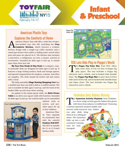 merican Plastic Toys will offer a wide line of injection-molded toys this fall, including the Cozy Comforts Kitchen, which features a realistic kitchen design with a single-cup coffee machine and a raised gas burner that makes a boiling water sound when pots and pans are placed on it. The kitchen also includes a microwave, a refrigerator, an oven, a toaster, and lots of accessories. Intended for kids ages 3 and up, it stands more than three feet tall. My Very Own Study & Play Desk is a compact, easyto-assemble desk set designed for kids ages 2 and up. It features a large writing surface; book and storage spaces; and special compartments for markers, crayons, and other art supplies. The desk stands 22 inches tall and comes with a stool. The fully assembled Huge Nesting Shopping Cart has a molded seat that can hold a doll or a stuffed animal. The cart is suitable for kids ages 3 and up, and the back of the basket folds up and away when nesting. An update to the classic picnic table, the Kid’s Picnic Table is an all-in-one square table with benches. Intended for kids ages 2 and up, the colorful table can be assembled without tools or screws, and proCozy Comforts Kitchen vides space for up to four children. American Plastic Toys expands its automotive line with the colorful Fashion Doll SUV. The SUV is suitable for 11- to 11.5-inch fashion dolls.