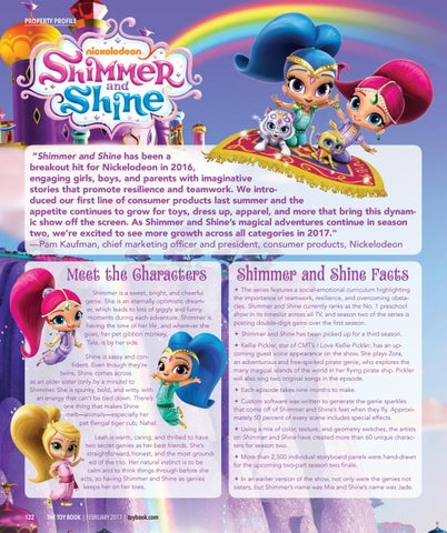 Meet the Characters Shimmer is a sweet, bright, and cheerful genie. She is an eternally optimistic dreamer, which leads to lots of giggly and funny moments during each adventure. Shimmer is having the time of her life, and wherever she goes, her pet gibbon monkey, Tala, is by her side. Shine is sassy and confident. Even though they’re twins, Shine comes across as an older sister (only by a minute) to Shimmer. She is spunky, bold, and witty, with an energy that can’t be tied down. There’s one thing that makes Shine melt—animals—especially her pet Bengal tiger cub, Nahal. Leah is warm, caring, and thrilled to have two secret genies as her best friends. She’s straightforward, honest, and the most grounded of the trio. Her natural instinct is to be calm and to think things through before she acts, so having Shimmer and Shine as genies keeps her on her toes.