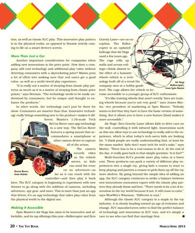 Gravity Laser—are no exception. The Rollercopter is an updated helicage that Air Hogs used a few years ago. The cage rolls up walls and across ceilings—think almost to the effect of a hamster wheel—which is a technology built off of a trend the Air Hogs Rollercopter, company sees at a hobby-grade from Spin Master level. The cage allows the vehicle to become accessible to a younger group of R/C enthusiasts. “It’s like training wheels that aren’t overtly ‘here are training wheels because you’re not very good,’” says James Martin, vice president of marketing at Spin Master. “Nobody wants to feel that they have to have the basic version of something. But it allows you to have a new feature [that] makes it more accessible.” Air Hogs’ Zero Gravity Laser allows kids to drive cars on the wall, controlling it with infrared light. Innovations such as this one allow toys to use technology to really add to the experience, which is what today’s tech-savvy kids are looking for. “I think people are really understanding that, at least for the mass market, kids don’t want tech for tech’s sake,” says Martin. “There has to be a real reason to do it. At the end of the day, it really goes back to that simple question: ‘Is it fun?”‘ Multi-function R/Cs provide more play value at a lower cost. These products can pack a variety of different play experiences into a single toy, giving kids a reason to want to keep playing and parents a reason to pick them up off the toy store shelves. By going beyond the simple idea of adding an app, the R/C category continues to strike a balance between new innovations consumers expect with the classic play pattern they already know and love. “There needs to be a lot of innovation in the toy world because if not, it will cease to exist,” says WowWee’s Wiseman. “Different is cool.” Although the classic R/C category is a staple in the toy industry, it is clearly heading toward an age of evolution and change. R/C manufacturers strive to find the perfect balance of technology and innovation in R/C toys, and it’s simply a race to see who can find that marriage first. ■