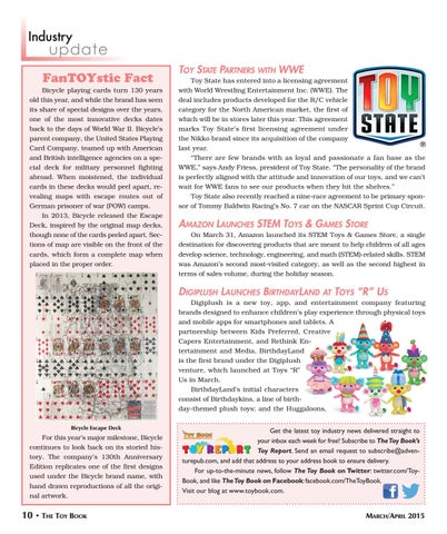 TOY STATE PARTNERS WITH WWE Toy State has entered into a licensing agreement with World Wrestling Entertainment Inc. (WWE). The deal includes products developed for the R/C vehicle category for the North American market, the first of which will be in stores later this year. This agreement marks Toy State’s first licensing agreement under the Nikko brand since its acquisition of the company last year. “There are few brands with as loyal and passionate a fan base as the WWE,” says Andy Friess, president of Toy State. “The personality of the brand is perfectly aligned with the attitude and innovation of our toys, and we can’t wait for WWE fans to see our products when they hit the shelves.” Toy State also recently reached a nine-race agreement to be primary sponsor of Tommy Baldwin Racing’s No. 7 car on the NASCAR Sprint Cup Circuit.