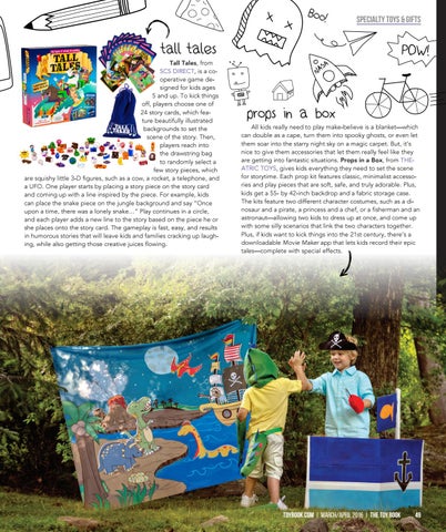 tall tales Tall Tales, from SCS DIRECT, is a cooperative game designed for kids ages 5 and up. To kick things off, players choose one of 24 story cards, which feature beautifully illustrated backgrounds to set the scene of the story. Then, players reach into the drawstring bag to randomly select a few story pieces, which are squishy little 3-D figures, such as a cow, a rocket, a telephone, and a UFO. One player starts by placing a story piece on the story card and coming up with a line inspired by the piece. For example, kids can place the snake piece on the jungle background and say “Once upon a time, there was a lonely snake…” Play continues in a circle, and each player adds a new line to the story based on the piece he or she places onto the story card. The gameplay is fast, easy, and results in humorous stories that will leave kids and families cracking up laughing, while also getting those creative juices flowing.