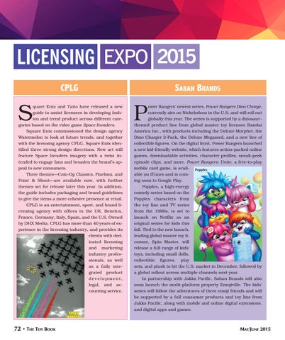 ower Rangers’ newest series, Power Rangers Dino Charge, currently airs on Nickelodeon in the U.S. and will roll out globally this year. The series is supported by a dinosaurthemed product line from global master toy licensee Bandai America Inc., with products including the Deluxe Morpher, the Dino Charger 3-Pack, the Deluxe Megazord, and a new line of collectible figures. On the digital front, Power Rangers launched a new kid-friendly website, which features action-packed online games, downloadable activities, character profiles, sneak-peek episode clips, and more. Power Rangers: Unite, a free-to-play mobile card game, is avail- Popples able on iTunes and is coming soon to Google Play. Popples, a high-energy comedy series based on the Popples characters from the toy line and TV series from the 1980s, is set to launch on Netflix as an original series for kids this fall. Tied to the new launch, leading global master toy licensee, Spin Master, will release a full range of kids’ toys, including small dolls, collectible figures, play sets, and plush to hit the U.S. market in December, followed by a global rollout across multiple channels next year. In partnership with Jakks Pacific, Saban Brands will also soon launch the multi-platform property Emojiville. The kids’ series will follow the adventures of three emoji friends and will be supported by a full consumer products and toy line from Jakks Pacific, along with mobile and online digital extensions, and digital apps and games.