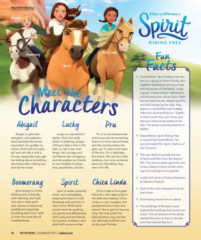 vv DreamWorks’ Spirit Riding Free is inspired by DreamWorks’ Oscar-nominated film Spirit: Stallion of the Cimarron. vv The new Spirit is actually the son of Spirit and Rain from the feature film. The show’s artists gave this new horse a blaze to show similar coloring and markings to his parents. vv Lucky’s full name is Fortuna Esperanza Navarro Prescott.