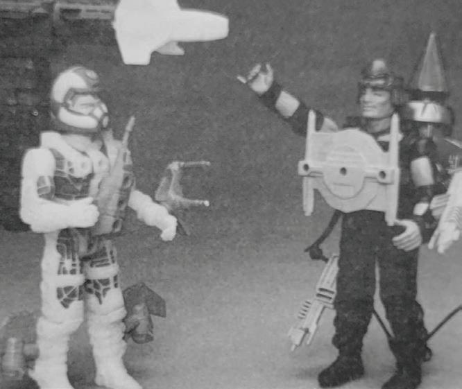 Each action figure comes with a laser light beam weapon and armor that has a special, photo-sensitive target on its chest. When this spot is touched by an enemy laser beam, a siren sound will ring to signify a direct hit.
