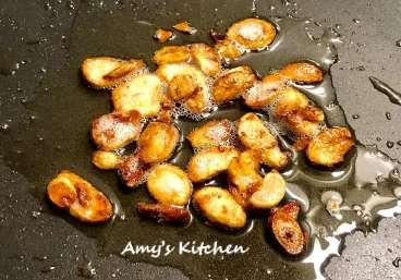 小火放(蒜片/鹽巴) 煸香蒜片。