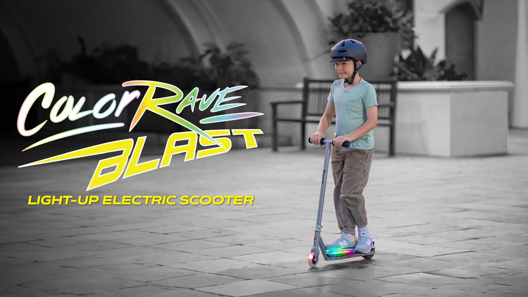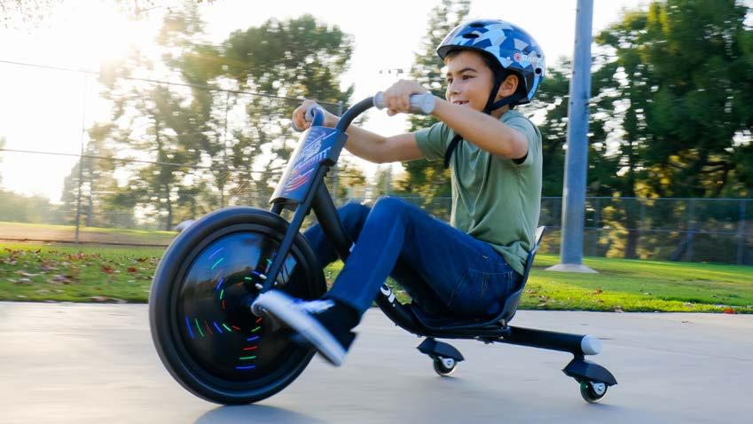 The RipRider 360 Lightshow has over 60 motion-activated, multi-color LED lights that create a spectacular effect while riding, spinning and drifting. The lights emanating from the front wheel, in the rider’s choice of three modes, automatically shut off after 10 seconds of inactivity to preserve battery life.