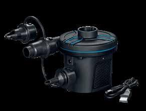 9. Built-in rechargeable batteries - 4x 1500 mAH capacity 10. USB powered 11. 3 valve adaptors to fit nearly every inflation valve 12. Full color box