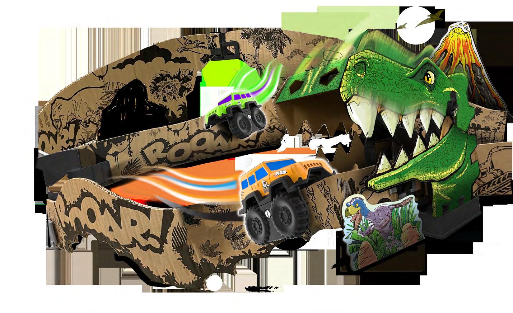 With the Off-Roader & Track set, children can use the recycled cardboard pieces to build their very own racetrack, then join the tracks with connectors and place them on the stands to get ready to race. Once placed on top of the dino themed racetrack, the mighty Off-Roader hurtles around the track edges, mastering the single plank bridge, blasting through the stunt jump and escaping the Dino tunnel.