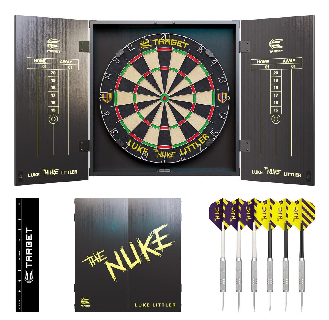 Created in collaboration with the renowned darts sensation, the premium Luke Littler Cabinet & Dartboard Set, meanwhile, boasts a player-endorsed dartboard housed within an elegant cabinet. The dartboard features a rotational score-ring, ultra-thin wire system, and staple-free bullseye for precise and rewarding gameplay. The board is crafted from self-healing African Sisal, which ensures durability and shape recovery and offers extended use. Complete with two sets of three brass darts with steel tip points, a competition-standard throw line for regulated gameplay and mini chalks for scorekeeping, this set equips players with everything they need for thrilling matches against friends and family. With the included assembly kit, setup is quick and hassle-free, allowing players to focus on enjoying the game.