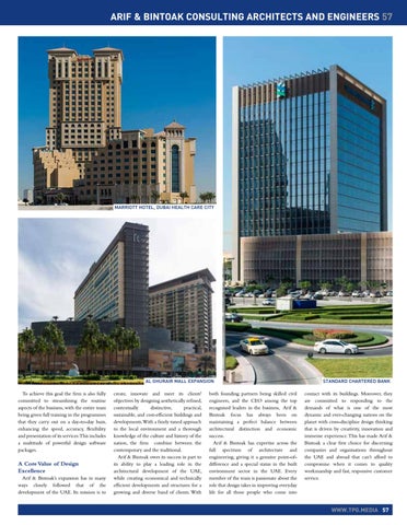 both founding partners being skilled civil engineers, and the CEO among the top recognised leaders in the business, Arif & Bintoak focus has always been on maintaining a perfect balance between architectural distinction and economic success. Arif & Bintoak has expertise across the full spectrum of architecture and engineering, giving it a genuine point-ofdifference and a special status in the built environment sector in the UAE. Every member of the team is passionate about the role that design takes in improving everyday life for all those people who come into
