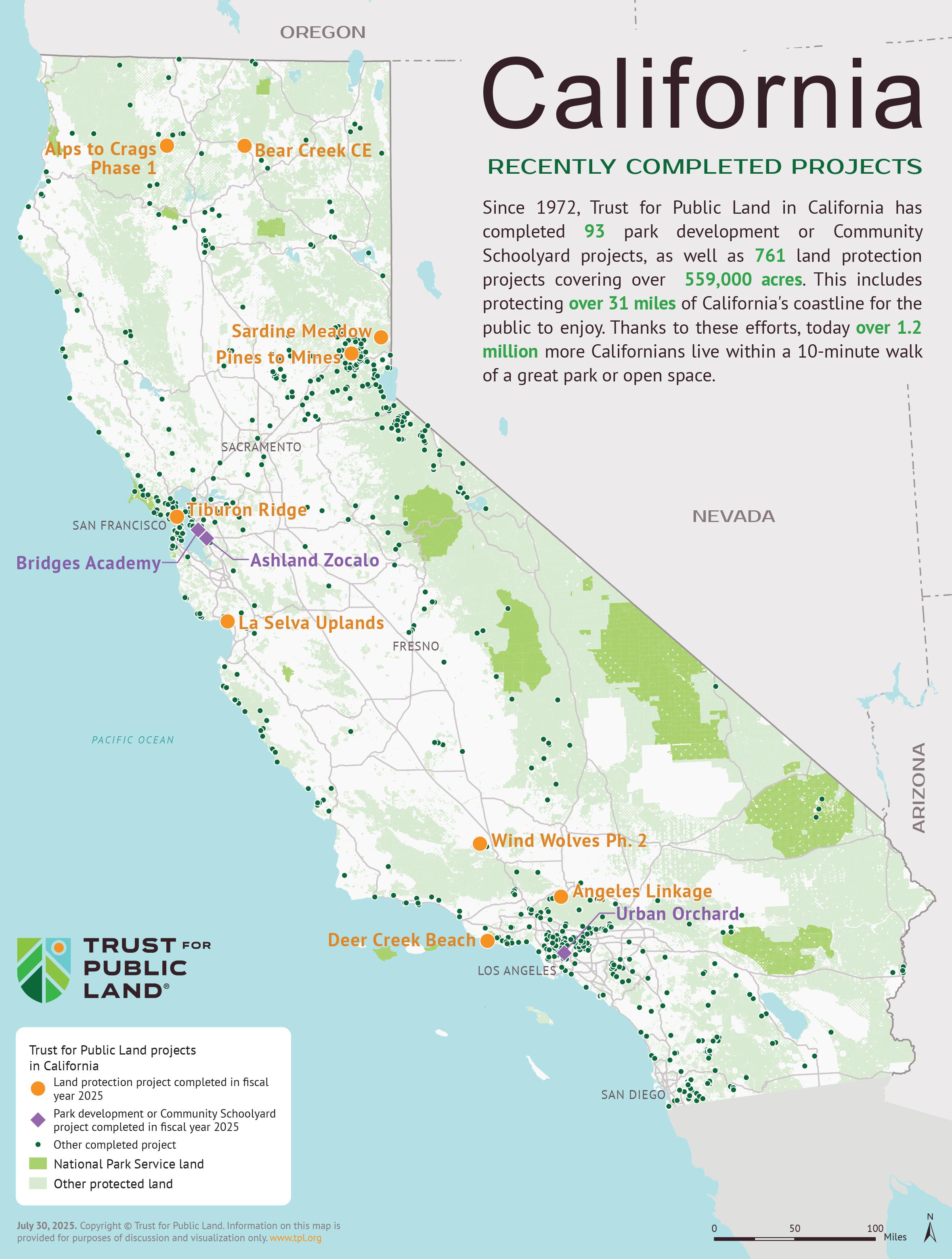 Your philanthropy makes it possible for us to engage in designing and advocating for measures like these. During the last fiscal year, California raised approximately $22 million, and TPL raised over $97 million. Together, we are safeguarding our lands, helping neighborhoods thrive, and building more resilient communities for the future.