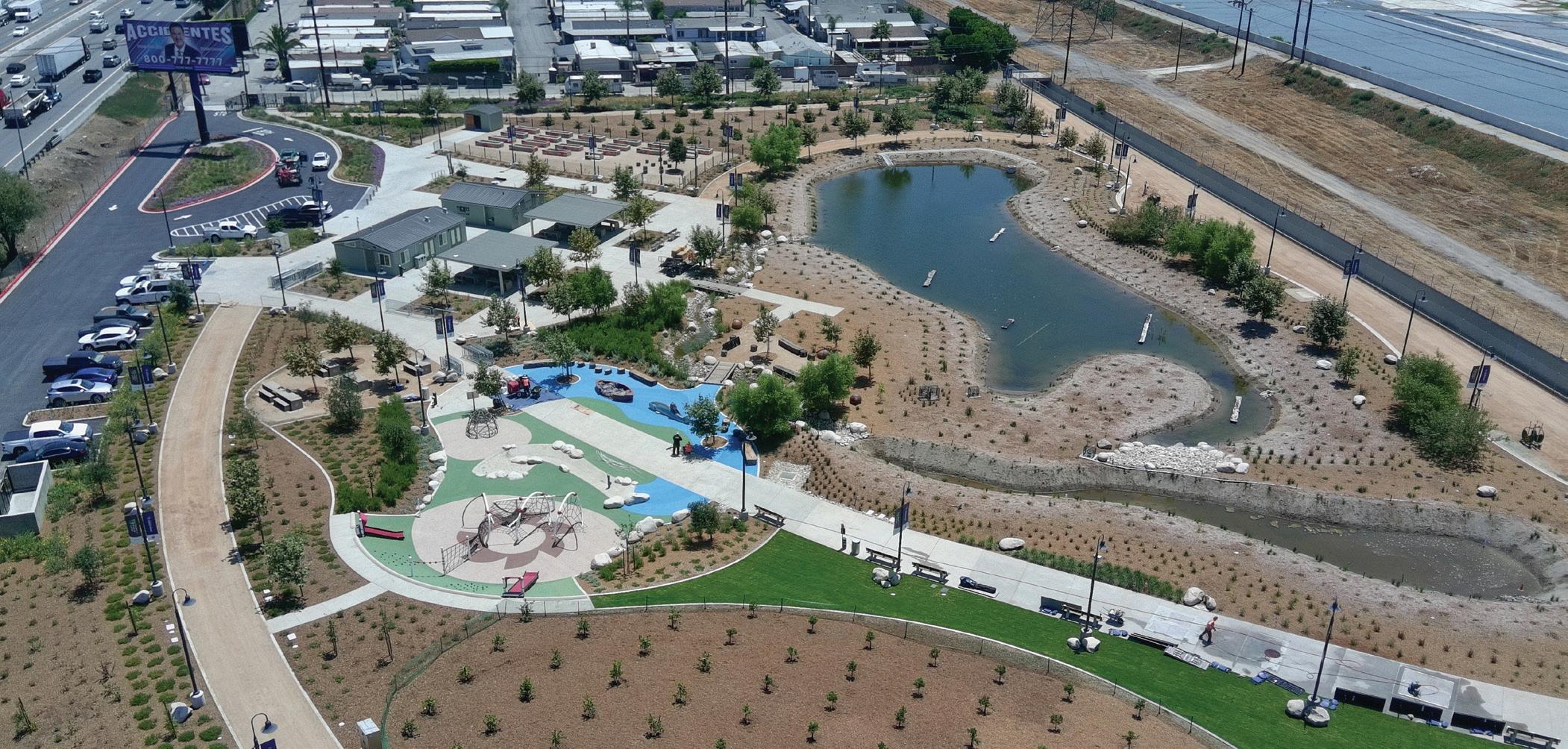 We are very excited to share that Urban Orchard Park opened July 2025. Previously a barren expanse of postindustrial land, Urban Orchard is now a vibrant community park in the City of South Gate. In a city where just three percent of land is made up of parks and nearly 40,000 residents lack access to green space, Urban Orchard is a beacon of hope. This seven-acre park boasts fruit trees, walking paths, native landscaping, an education garden, and a nature-based playground.