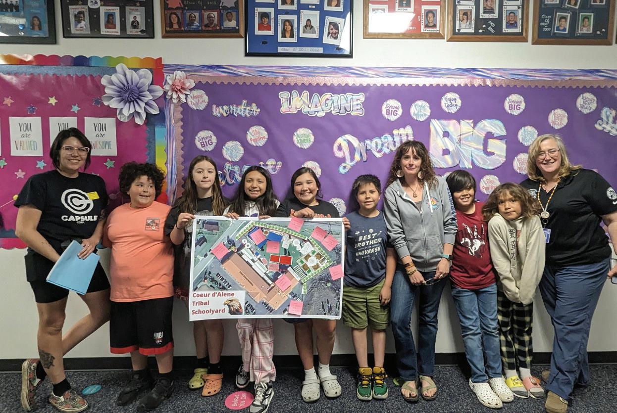 One of the nine pilot program schools—chosen through a data-driven process that prioritized locations on their potential to bolster health, education, and environmental justice—is Coeur D’Alene Tribal School in De Smet, Idaho. Playing an active role in the planning process, the Coeur D’Alene Tribe, students, and school leadership contributed to a concept design which envisioned community gardens with a greenhouse and nursery; an outdoor classroom; canoes and tipis; murals; a meadow restoration; and cultural activities, demonstrations, and celebrations. Once complete, the Coeur D’Alene’s Tribal School’s 116 students will be able to play, learn, and grow within a lush green space that instills them with a sense of pride, pays tribute to their cultural heritage, is tailored to their needs, and which they can truly call their own.