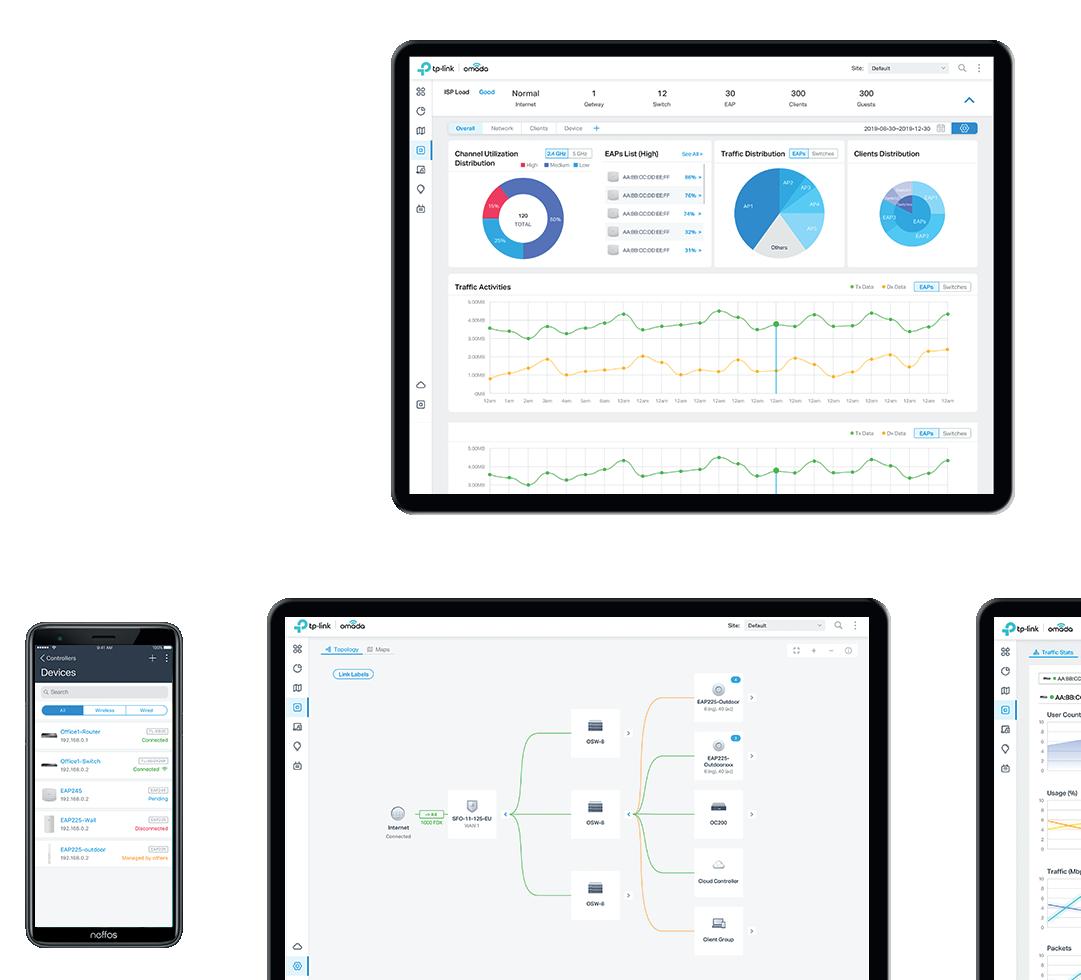 Administre de forma centralizada sus puntos de acceso, switches, routers y más, en cualquier lugar y en cualquier momento, todo controlado desde una única interfaz fácil de usar.