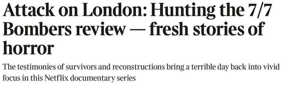 Attack on London: Hunting the 7/7 Bombers was critically acclaimed and became the Number 1 series on Netflix UK - temporarily taking over from Squid Games - despite competing with four other series. There were 227 pieces of coverage across national print and online, regional press, radio, TV and listings magazines. The sum of opportunities to see (OTS) was 436M and advertising value equivalent (AVE) was £3.61M (these figures only account for print and online press and don't include TV and radio).