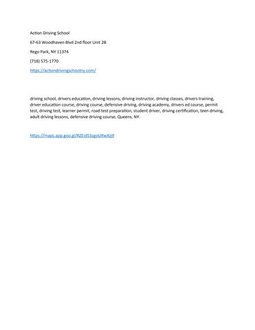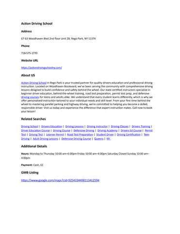 Phone 718-575-1770 About US Action Driving School in Rego Park is your trusted partner for quality drivers education and professional driving instruction. Located on Woodhaven Boulevard, we've been serving the community with comprehensive driving lessons designed to build confidence and safety behind the wheel. Our state-certified instructors specialize in beginner driver education, behind-the-wheel training, road test preparation, permit test prep, and defensive driving courses for teens and adults alike. We understand that every student learns differently, which is why we offer personalized instruction tailored to your individual needs and skill level. From your first time behind the wheel to mastering parallel parking and highway driving, we're committed to helping you become a skilled, responsible driver. Visit us today and experience the difference that expert instruction makes. Call now to book your lesson! Related Searches Driving School | Drivers Education | Driving Lessons | Driving Instructor | Driving Classes | Drivers Training | Driver Education Course | Driving Course | Defensive Driving | Driving Academy | Drivers Ed Course | Permit Test | Driving Test | Learner Permit | Road Test Preparation | Student Driver | Driving Certification | Teen Driving | Adult Driving Lessons | Defensive Driving Course | Queens | NY. Additional Details Hours: Monday to Thursday 10:00 am–6:00pm Friday 10:00 am–4:00pm Saturday Closed Sunday 10:00 am–4:00pm Payment: Cash, CC GMB Listing https://www.google.com/maps?cid=9254334498113412594