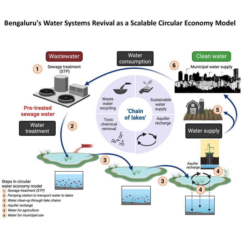 Building on this understanding, the design proposal advances a projective framework for peri-urban Bengaluru grounded in a circular water economy and sectional thinking. Rather than extending development uniformly across the landscape, growth is reimagined as clustered interventions aligned with hydrological capacity. Secondary-treated wastewater from sewage treatment plants is redirected into historic lake chains, where constructed wetlands slow, filter, and distribute water across valleys. Through soil percolation, this water recharges shallow aquifers accessed via open wells and further treated for potable use.