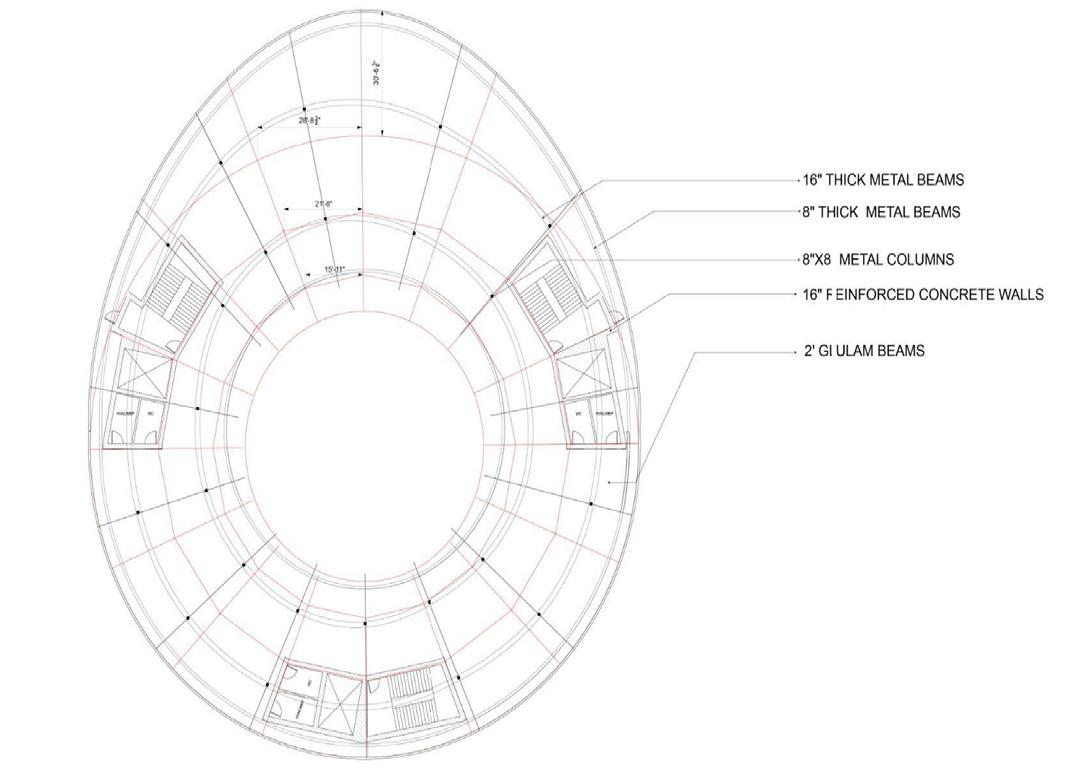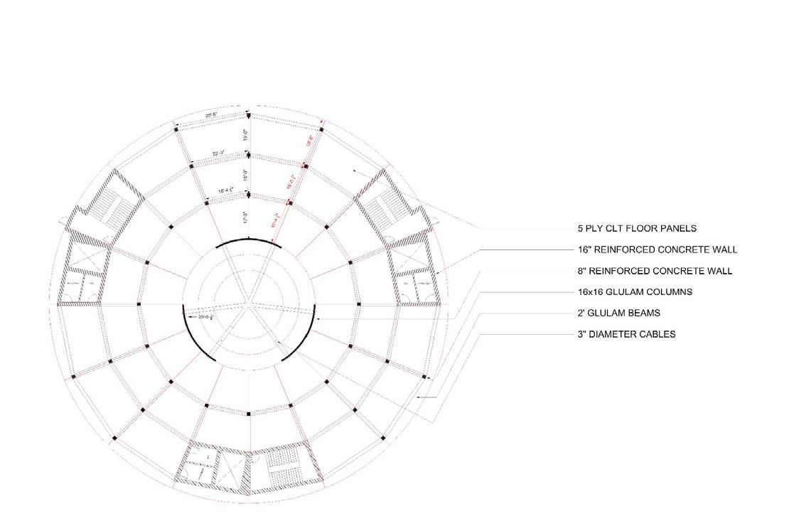 Lateral stability is achieved through the continuous perimeter shear wall and strategically placed vertical circulation cores, which act as stiffening elements resisting seismic and wind forces—particularly critical in the Los Angeles seismic context. These cores are integrated into the plan symmetrically, ensuring torsional stability within the circular form.