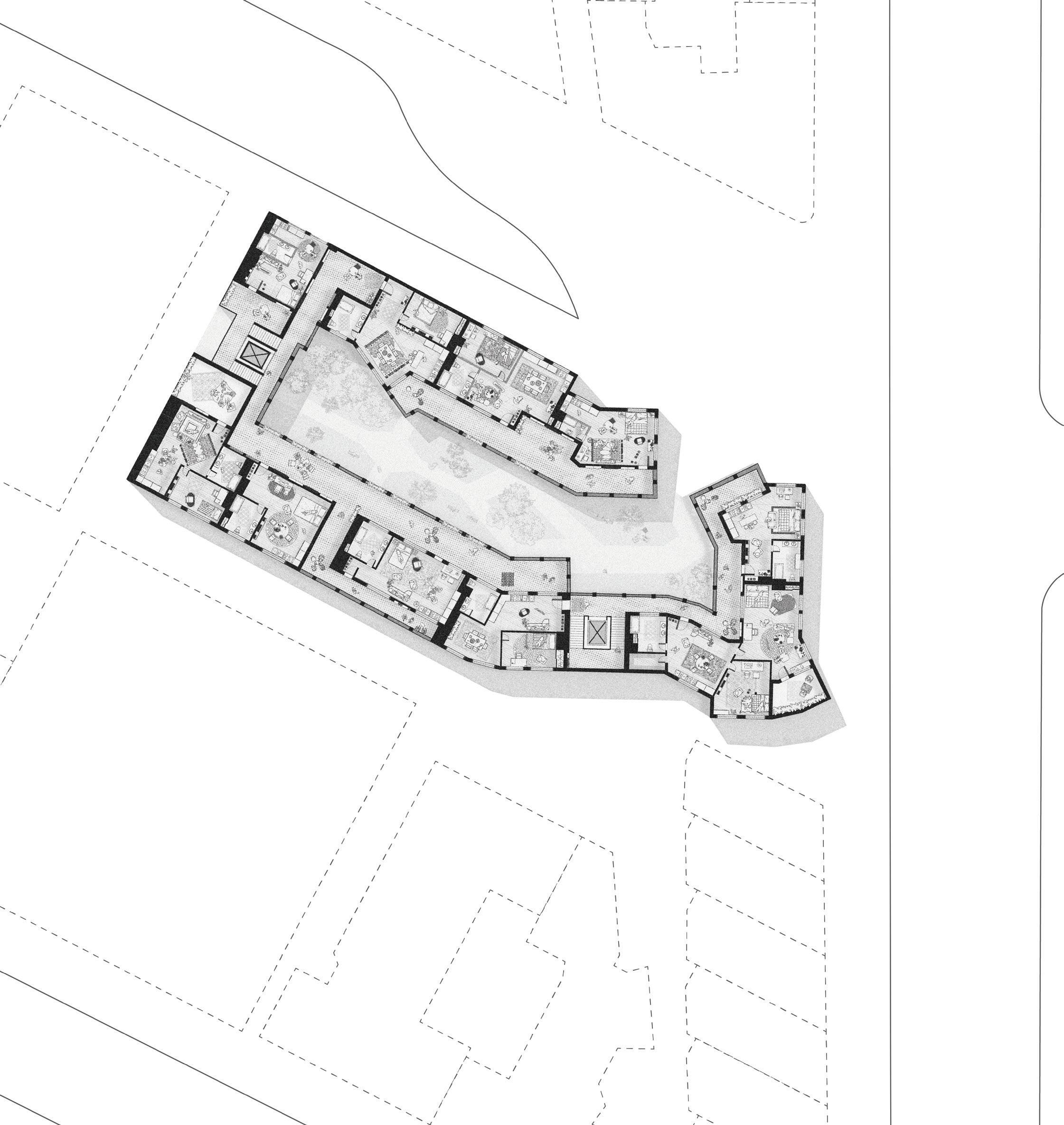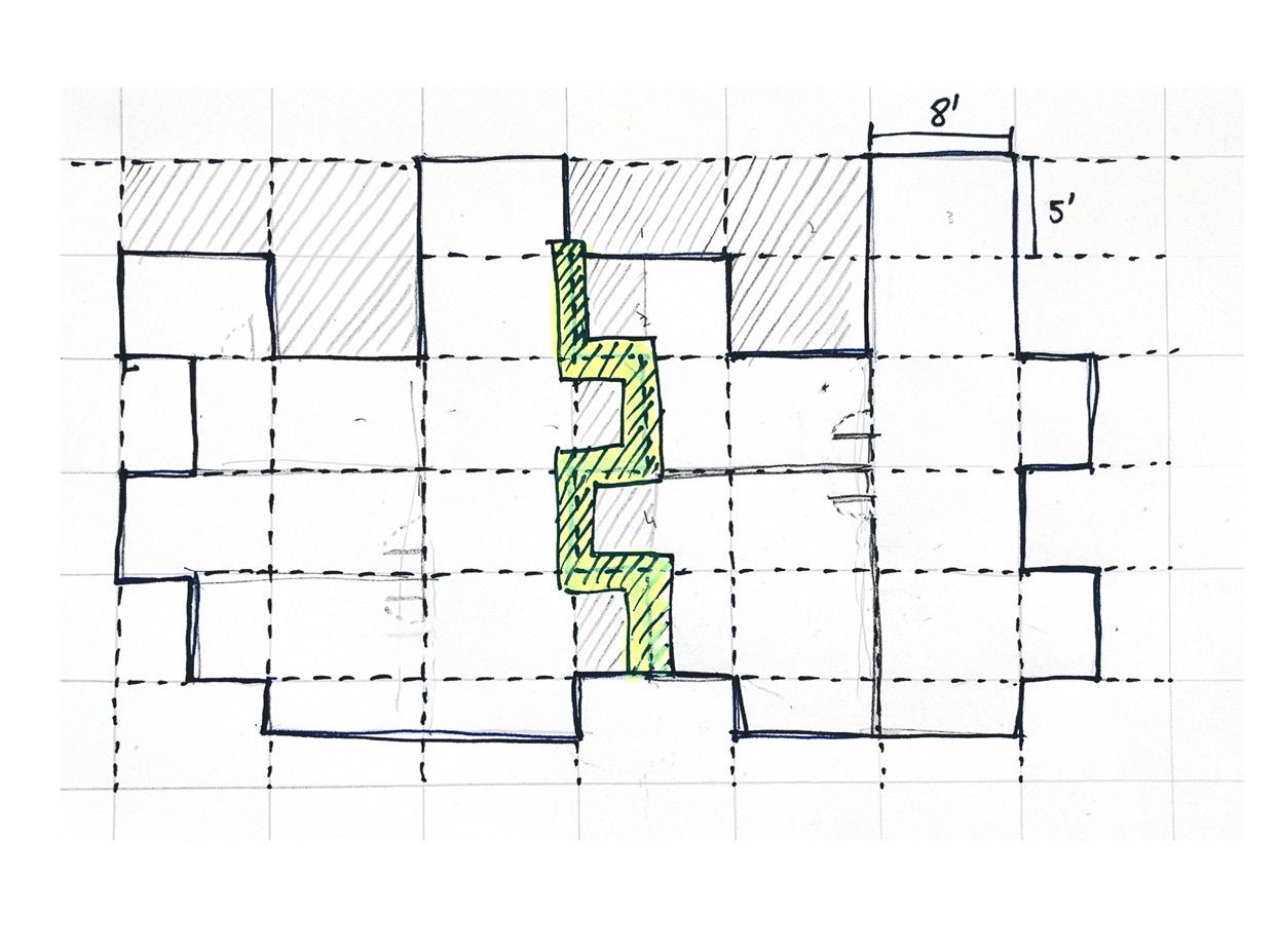 The apartments are generated from a 5ft × 8ft planning grid, which acts as both a dimensional discipline and a social framework. Rather than treating walls as flat separators, each unit’s perimeter steps in and out along the grid, producing a thickened edge condition. These interlocking wall segments align across adjacent apartments, allowing units to nest into one another rather than sit as isolated boxes.