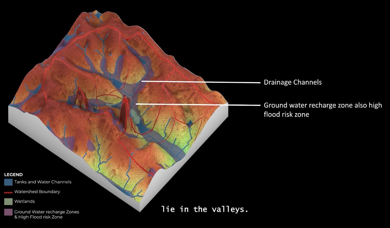 This project positions Bengaluru’s water landscape as an active system shaped by monsoon cycles, topography, and long-term patterns of settlement rather than as a technical problem to be solved through isolated infrastructure. By working with drainage channels, lake chains, and shallow aquifers, the proposals reintroduce continuity to a fragmented hydrological network, allowing water to slow, spread, and recharge within designed thresholds. Flooding is not treated as an exception, but as a seasonal condition that can be spatially accommodated and made legible through landscape form.